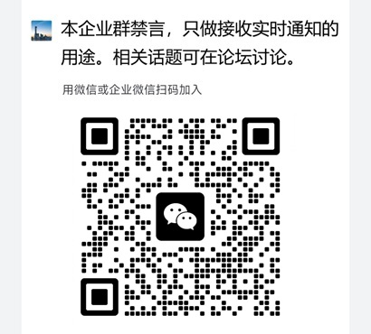 请扫码加入企业群聊,本群禁言,只做接收实时消息用途。如被踢出,请重新扫码加入。如被封,请联系论坛管理员。